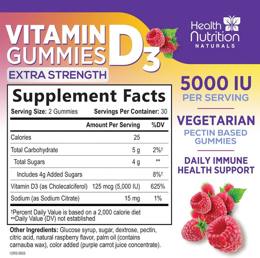 Health Nutrition NaturalsOur Extra Strength Vitamin D3 Gummies, with 5000 IU (125 mcg) per serving, offer a premium solution to provide immune support, bones support and mu...
