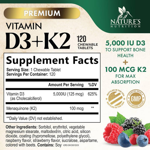 View full detailsVitamin D3 K2 Supplement | 5000 IU D3 + K2 100 mcg | MK-7 K2 with Vitamin D | Supports Immune, Heart, Teeth & Bone Health - Nature's Easy to Chew, VIT D3 K2, Non-GMO, Tasty Berry Flavor - 120 Tablets