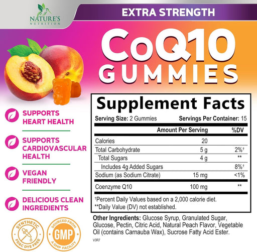 View full detailsNature's Nutrition CoQ10 Gummies 100mg – High Absorption Coenzyme Q10 Supplement for Heart Health, Energy & Antioxidant Support – Peach Flavor Gummy, Vegan, Non-GMO, Gluten Free – 30 Count