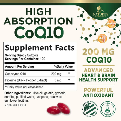 CoQ10 200mg Softgels - Extra Strength Coenzyme Q10 Supplement With Black Pepper Extract for Enhanced Absorption, CoQ10 Antioxidant Supplements for Heart Health & Cellular Energy Support - 240 Softgels