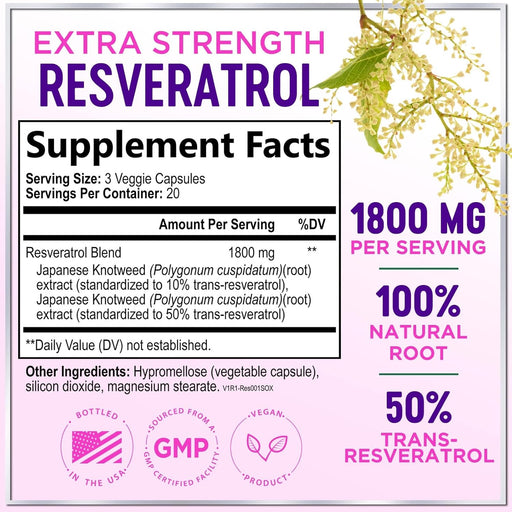 Resveratrol Supplement 1800mg: Extra strength resveratrol capsules designed to support aging, heart health, cellular energy production and overall...