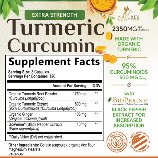 Turmeric Curcumin Supplement 1750mg with Organic Turmeric & Ginger, 95% Curcuminoids, BioPerine Black Pepper for Best Absorption, Nature's Vegan Joint Support, Non-GMO, Bottled in USA - 360 Capsules