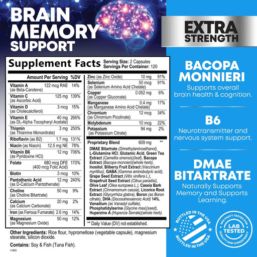 View full detailsBrain Memory Supplement Pills - Nootropics Support for Concentration, Clarity, Alertness & Focus - Brain Health with Bacopa, Cognitive Vitamins, Phosphatidylserine, DMAE - Brain Booster - 120 Capsules