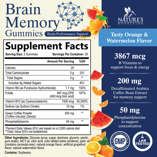 Nature's NutritionNootropic Brain Memory Support Supplement Gummy - For Mental Focus & Concentration - Brain Health & Energy with B12, Phosphatidylserine, Co...