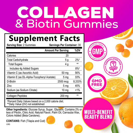 View full detailsCollagen Gummies with 2500mcg Biotin, Vitamin C & Zinc - Hydrolyzed Collagen Peptide Type 1 & 3 Supplement - Advanced Hair, Skin & Nail Growth Support for Women & Men, Gluten Free, Non-GMO - 60 Count
