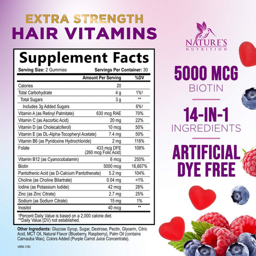 Nature’s Nutrition Hair Vitamins, a premium hair growth supplement made for healthy strong hair support, for both women and men. With 5000 mcg of B...