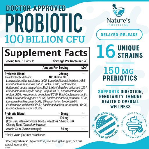 View full detailsNature's Physician Probiotics - 100 Billion CFU - 16 Strains + Prebiotics - Best Probiotic Supplement for Women & Men - Supports Immune, Digestive Health, Occasional Constipation & Gas - 30 Capsules