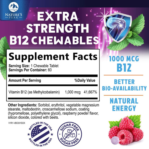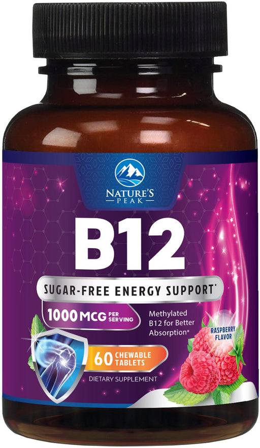 View full detailsVitamin B12 1000 mcg (Methylcobalamin) Super B 12 Complex Dietary Supplement for Energy & Immune Support, Vegan, Sugar-Free, Sublingual, Tasty Raspberry Flavor - 60 Chewable Tablets, 60 Day Supply