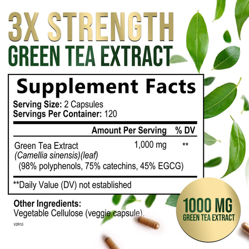 View full detailsGreen Tea Extract Capsules 1000 mg - Standardized 45% EGCG & 98% Polyphenols - 3X Strength Green Tea Pills for Natural Energy - Supports Heart Health, Herbal Supplement, Vegan, Non-GMO - 120 Capsules