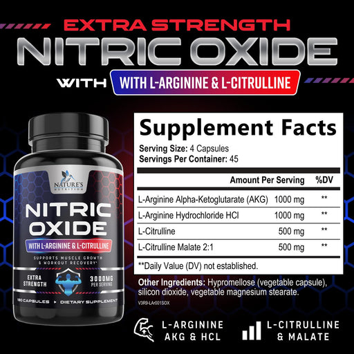 View full detailsNitric Oxide Booster Extra Strength 3000mg - L Arginine 3X Strength Nitric Oxide Supplements for Men and Women, Citrulline, Supports Muscle, Heart Health & Energy Supplement, Non-GMO - 180 Capsules