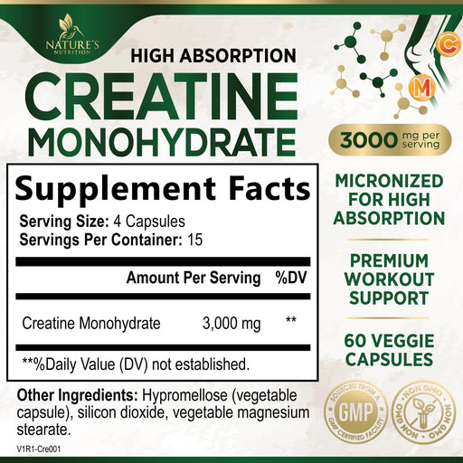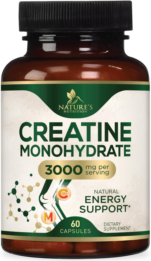 View full detailsCreatine Monohydrate Capsules 3000mg – Best Micronized Creatine Powder - Supports Lean Muscle, Strength, Energy, & Endurance - Nature's Supplement, Non-GMO, Gluten Free for Women & Men - 60 Capsules