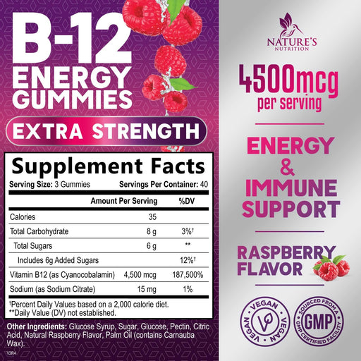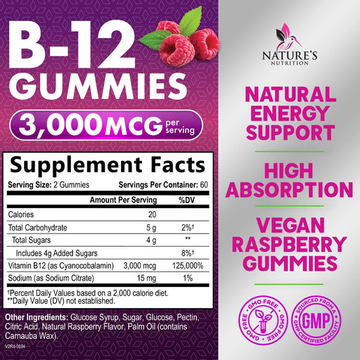 Nature's NutritionSupport your energy and wellness with our Vitamin B12 Gummies, delivering 3000 mcg of extra strength Vitamin B12 in every serving. Designed to supp...