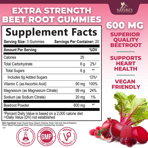 Nature's NutritionSupport your energy and heart health the tasty way with our Beet Root Supplement Gummies. Each serving delivers 500mg of premium beet root extract ...