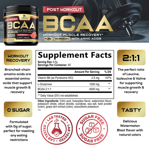 View full detailsBCAA Powder 4g BCAA Amino Acids 2:1:1, 1g L-Glutamine, Vitamin B6 Complex - Energy Daily Powder Replenisher Post Workout - Muscle Recovery Support Drink for Men & Women, Sugar Free, Keto - 45 Servings