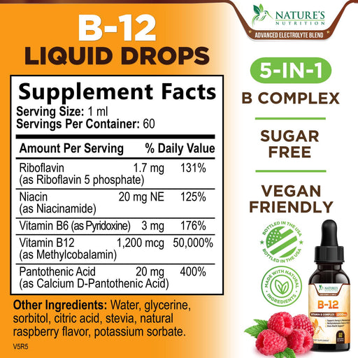 View full detailsVegan B-12 Vitamin Supplement Drops (Methylcobalamin) Extra Strength Super B Complex - Sublingual B12 Liquid for Immune Support, Heart Health & Cellular Energy Support, Raspberry Flavored - 2 Fl Oz
