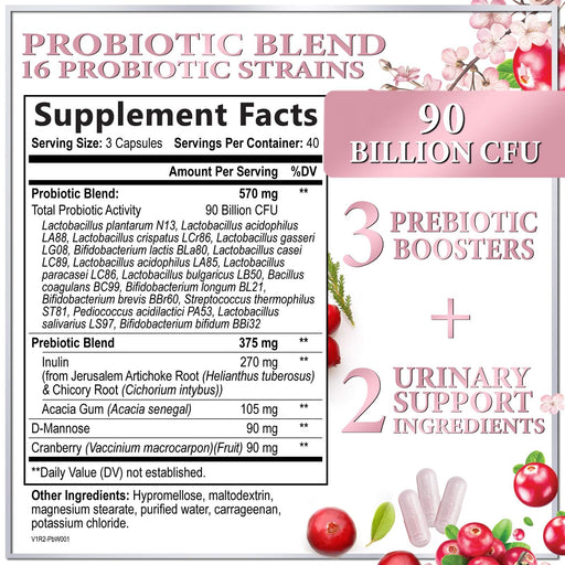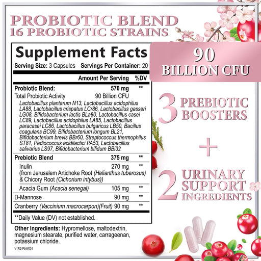 Probiotics for Women Supplement with Cranberry - 16 Premium Strains for PH Balance, Digestive Health, Vaginal & Immune Support, 90 Billion CFU, Women's Probiotic, UT, & Feminine Health - 60 Capsules