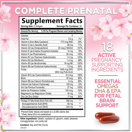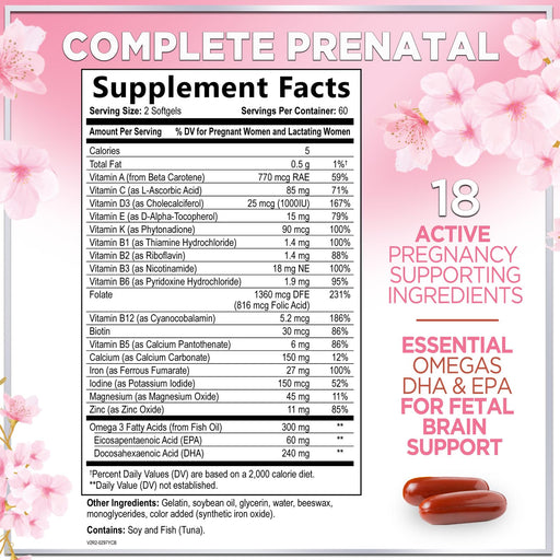 View full detailsPrenatal Vitamins For Women With Folic Acid, DHA & Iron - Women's Prenatal Multivitamin, Essential Pre Natal Vitamins with Folate, Omega 3, D3, B12, Pregnancy Supplement for Mom & Baby - 120 Softgels