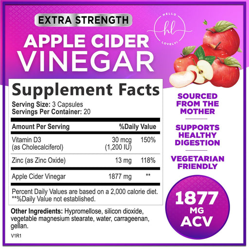 Hello Lovely!Boost your wellness with Apple Cider Vinegar Pills with Vitamin D3 & Zinc! These powerful ACV pills pack 1877mg of premium apple vinegar, surpa...
