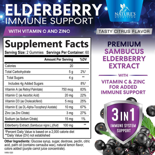Nature's NutritionIntroducing our Elderberry Immune Support Gummies. Crafted with a potent blend of elderberry, Vitamin C, and Zinc, these delicious, chewable gummie...