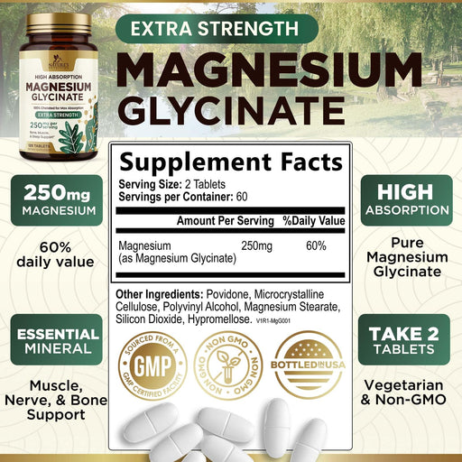 View full detailsMagnesium (Glycinate) - Magnesium Supplement for Heart Health, Nerve, Muscle, Bone, and Sleep Support - 100% Chelated & High Absorption - 250 mg per Serving - Gluten Free, Vegan, Non-GMO - 60 Count