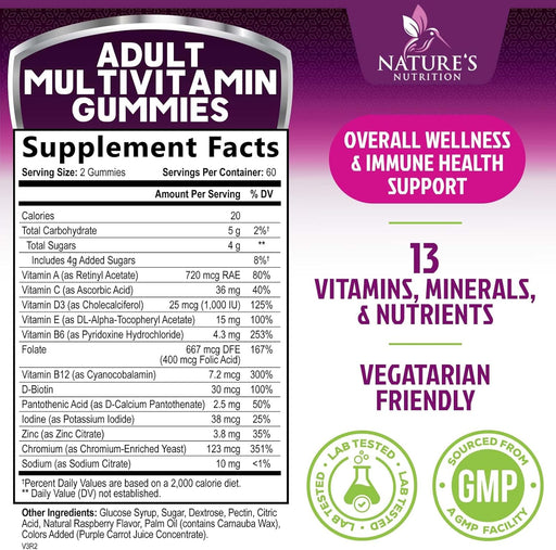 Nature's NutritionSupport your health with Natures Nutrition for Adults Multivitamin Gummies—a tasty, berry-flavored gummy vitamin for both men & women. Each dai...