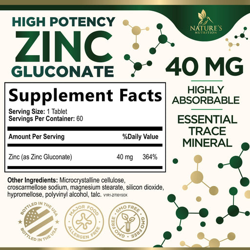 Nature's NutritionSupport daily wellness with our high potency zinc supplements, delivering 40mg of zinc gluconate per tablet.This essential zinc vitamin helps suppo...