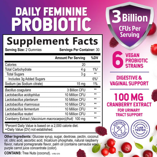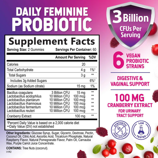 View full detailsProbiotics for Women Gummies with Cranberry - 6 Premium Strains for PH Balance, Digestive Health, Vaginal & Immune Support, 3 Billion CFU, Women's Probiotic Gummy for Feminine Health - 60 Gummies