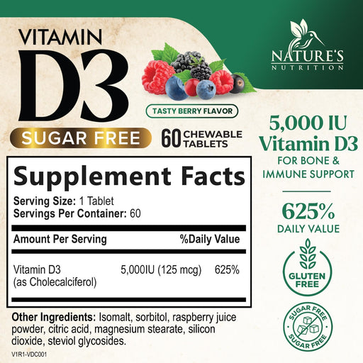 View full detailsVitamin D3 5000 IU (125 mcg) Nature's Extra Strength Vitamin D Supplement Chewable for Immune Support Health - Bone, Teeth and Muscle Supplements - Sugar Free, Non-GMO, Gluten Free - 60 Count Tablets
