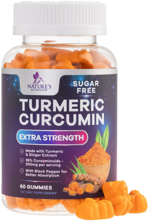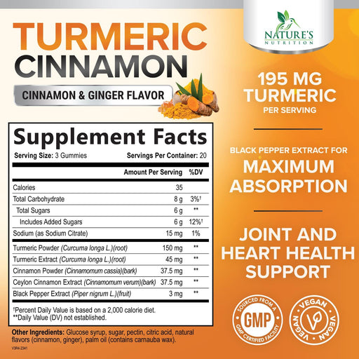 View full detailsTurmeric Curcumin Supplement Gummies with Ginger & Cinnamon, 95% Curcuminoids Turmeric Curcumin Gummy with Black Pepper for Best Absorption, Nature's Vegan Joint Support Tumeric, Non-GMO, 60 Gummies