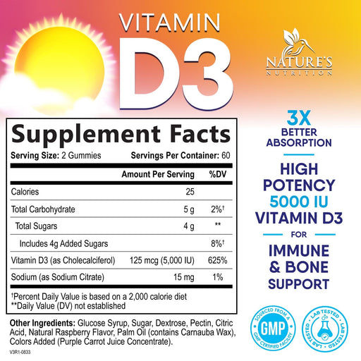 Vitamin D3 Supplement Gummy 5000 IU (125 mcg) Dietary Vitamins D for Men & Women - Bone, Teeth, Muscle & Immune Health Support, High Potency VIT D3 Nature's Non-GMO & Gluten Free - 60 Gummies