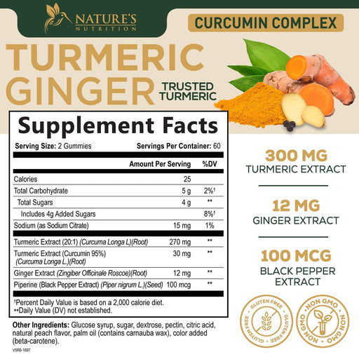 View full detailsTurmeric Gummies with Black Pepper & Ginger for Best Absorption, 95% Curcuminoids Tumeric Curcumin Gummy, Nature's Herbal Extract Joint Support Supplement, Vegan Non-GMO, Peach Flavor - 120 Gummies