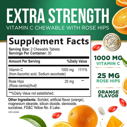 View full detailsVitamin C Chewable 1000mg - Extra Strength Antioxidants for Powerful Immune Support w/Vitamin C & Rose HIPS - Potent Dietary VIT C Chews Supplement, Natural, Vegan, Gluten-Free, Non-GMO - 60 Tablets