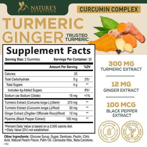 View full detailsTurmeric and Ginger Gummies - Vegan Turmeric Curcumin Gummies with Black Pepper Extract for High Absorption, Nature's Curcumin Gummy for Joint Support Supplement, Non-GMO, Gluten Free - 60 Count