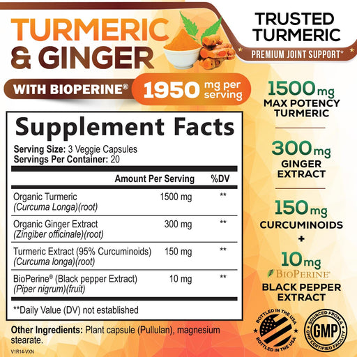 View full detailsTurmeric Curcumin Supplement 2600mg with Organic Ginger & Turmeric, BioPerine Black Pepper Extract 95% Curcuminoids - Advanced Absorption Joint & Antioxidant Extra Strength Support - 60 Capsules