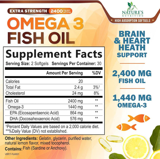 View full detailsOmega 3 Fish Oil 2400 mg - Triple Strength EPA & DHA Fatty Acids for Heart, Brain & Joint Support Wild-Caught, Burpless, Lemon Flavor Supplement Natural, Non-GMO, Gluten-Free - 60 Softgels