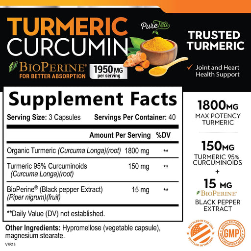 Turmeric Curcumin Supplement with BioPerine 1950mg, 95% Standardized Curcuminoids - Black Pepper for Advanced Absorption, Herbal Joint Support Complex, Nature's Tumeric Extract Non-GMO - 120 Capsules