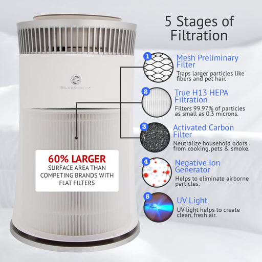 View full detailsAir Purifier for Home Large Room – Covers Up to 500 Sq Ft, 5-in-1 HEPA Filter System for Allergies, Pets, Smoke, Remove Dust & Odor – Quiet Sleep Mode, High Filtration Efficiency – SILVERONYX, White