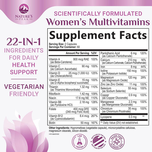 Multivitamin for Women - Complete Daily Womens Multivitamins with Calcium, Folate, Vitamin A, C, D, E & B Vitamins, Zinc and Iron - Multi Vitamins for Bone, Energy & Immune Support - 60 Capsules